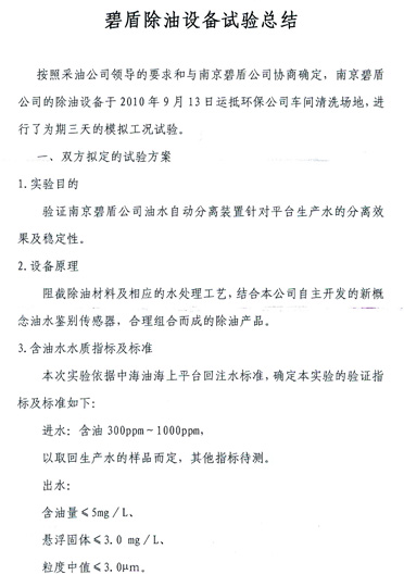 碧盾公司采用阻截除油技术,针对����� �������Ƴ������������ �������Ƴ�������海上钻井平台的工作特点,专门设计了占地小����� �������Ƴ������������ �������Ƴ������������ �������Ƴ������������ �������Ƴ�������,高效、高精度的海上钻井平台采����� �������Ƴ������������ �������Ƴ������������ �������Ƴ������������ �������Ƴ������出水处理装置,海上采油平台����� �������Ƴ������������ �������Ƴ�������含油����� �������Ƴ�������� �������Ƴ������������ �������Ƴ������������ �������Ƴ������������ �������Ƴ�����������废水处理系统装置(撬装),2010年9月����� �������Ƴ������������ �������Ƴ������������ �������Ƴ�������,在天津中海油环保服务公司进行现����� �������Ƴ������������ �������Ƴ������������ �������Ƴ�������场试验,取得中试成功。所检测的出水数据均低于����� �������Ƴ������������ �������Ƴ������������ �������Ƴ������������ �������Ƴ�������0.01ppm,远低于15����� ��������� �������Ƴ������������ �������Ƴ����������Ƴ�������ppm的����� �������Ƴ������������ �������Ƴ�������排放标准。