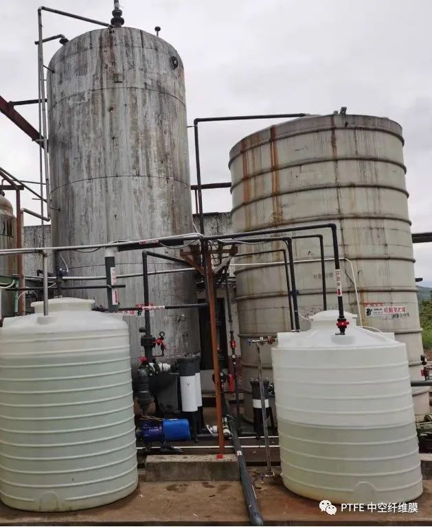 来水→原水罐(蒸汽加热)→����� �������Ƴ������������ �������Ƴ�������原水泵→加碱→原水保安过滤器(����� �������Ƴ������������ �������Ƴ����������� �������Ƴ������������ �������Ƴ�������两级:10μm、1μm)→PTFE中空纤维膜脱氨装置(三级)→产水。