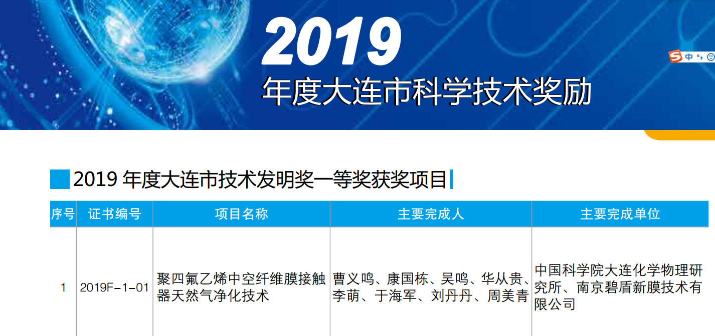 由中国科学院大连化学����� �������Ƴ������������ �������Ƴ�������物理研究所、南京碧盾新膜技术有限公司共同研发的聚����� �������Ƴ������������ �������Ƴ�������四氟乙烯中空纤维膜接触器����� �������Ƴ������������ �������Ƴ����������� �������Ƴ������������ �������Ƴ�������天然气净化技术获得了2019 年度大连市����� �������Ƴ������������ �������Ƴ������������ �������Ƴ������������ �������Ƴ�������技术发明奖一等奖。